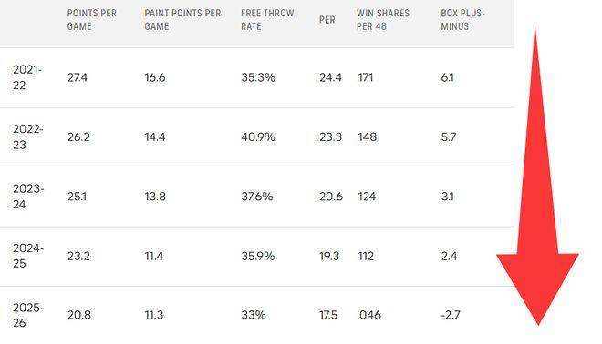莫兰特最近的表现并不像一个巨星。无论你是看得分数据还是高级指标,数据都表明,自2022年达到巅峰以来,莫兰特的表现一直在慢慢下降,场均得分从27.4分一路下滑至20.8分,连续4年下降。虽然莫兰特只有26岁,但这些数据不由让人觉得他已过巅峰,处于下降的通道中。